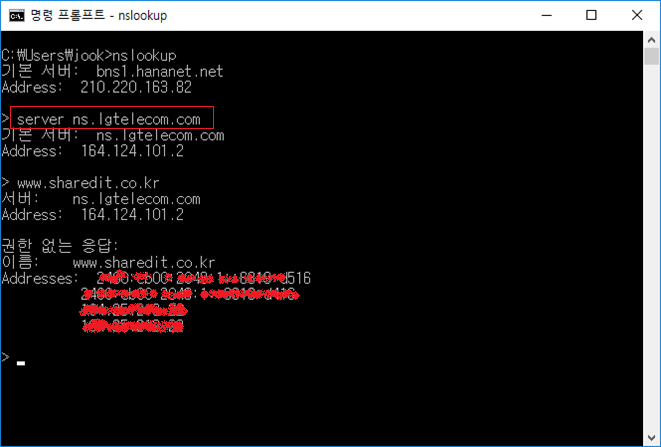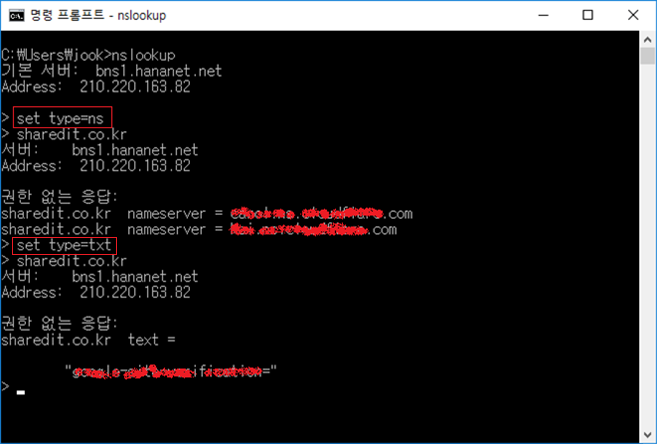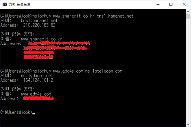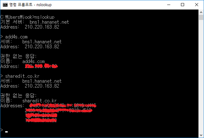 - nslookup 프롬프트로 진입한 후, 도메인 조회