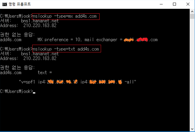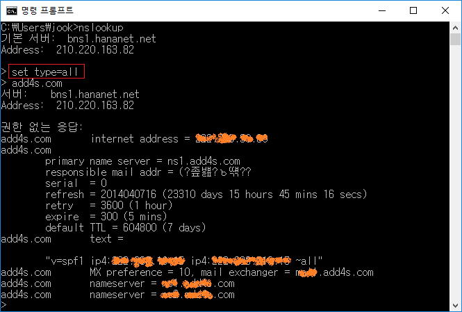 - 네임서버에서 해당 도메인의 zone 파일에 아래의 레코드 정보가 등록되어 있는 경우는 nslookup을 통해서 조회가 가능하다.