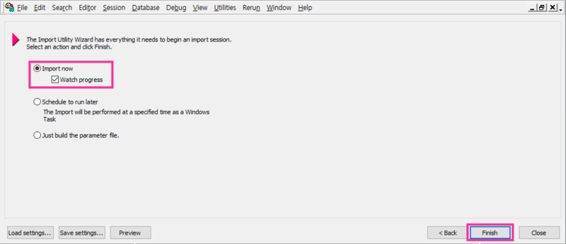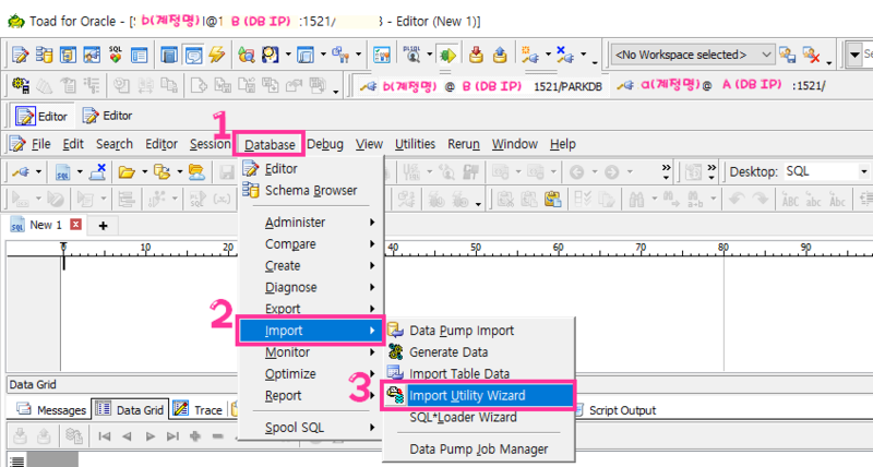 B DB서버의 b계정으로 로그인한 session에서 Database 메뉴 클릭 > Import 클릭 > Import Utility Wizard 클릭