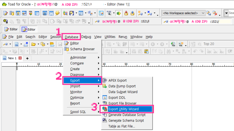 ● 방법: ① A DB서버의 a계정으로 로그인 > ② Wizard로 Database EXPORT > ③ B DB서버의 b계정으로 로그인 > ④ Wizard로 Database IMPORT