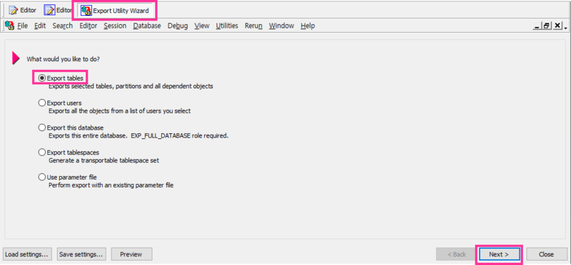 Export Utility Wizard 창에서 Export tables 체크(Default) > Next > 버튼 클릭