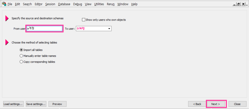 From user에 a계정명(DMP Export한 계정) 입력 > Next > 버튼 클릭