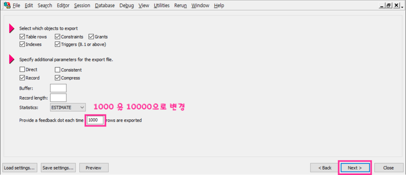 ... 버튼 클릭 > 덤프파일(DMP) 저장할 위치와 파일명 정하기(세개의 빈칸이 다 채워짐) > Next > 버튼 클릭