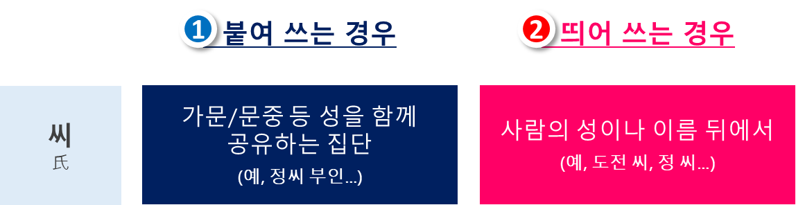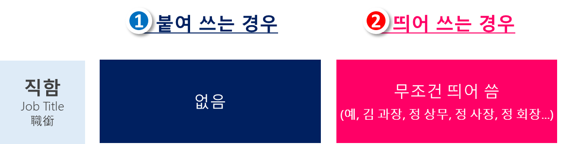 '직함'은 아래의 ②번과 같이 앞 글자(주로 성, 이름, 성+이름)와 무조건 띄어 써야 합니다.