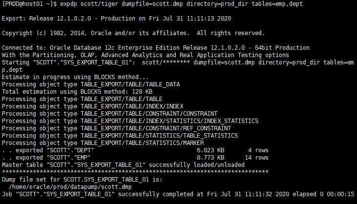 [PROD@host01 ~]$ expdp scott/tiger dumpfile=scott.dmp directory=prod_dir tables=emp,dept