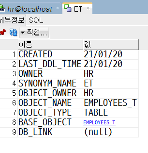 좌측 '접속' 탭, hr 계정 접속 하위메뉴 중 '동의어' 하위에 'ET'가 추가되었습니다.