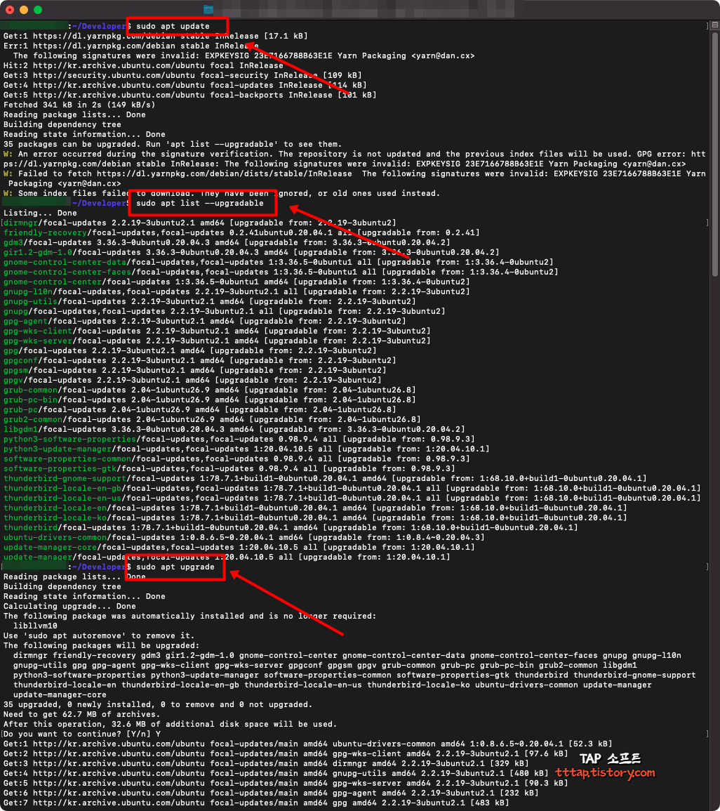 이제 설치가 필요한 리스트를 확인했다면 upgrade 명령어를 통해 실제 업데이트를 할 수 있습니다.