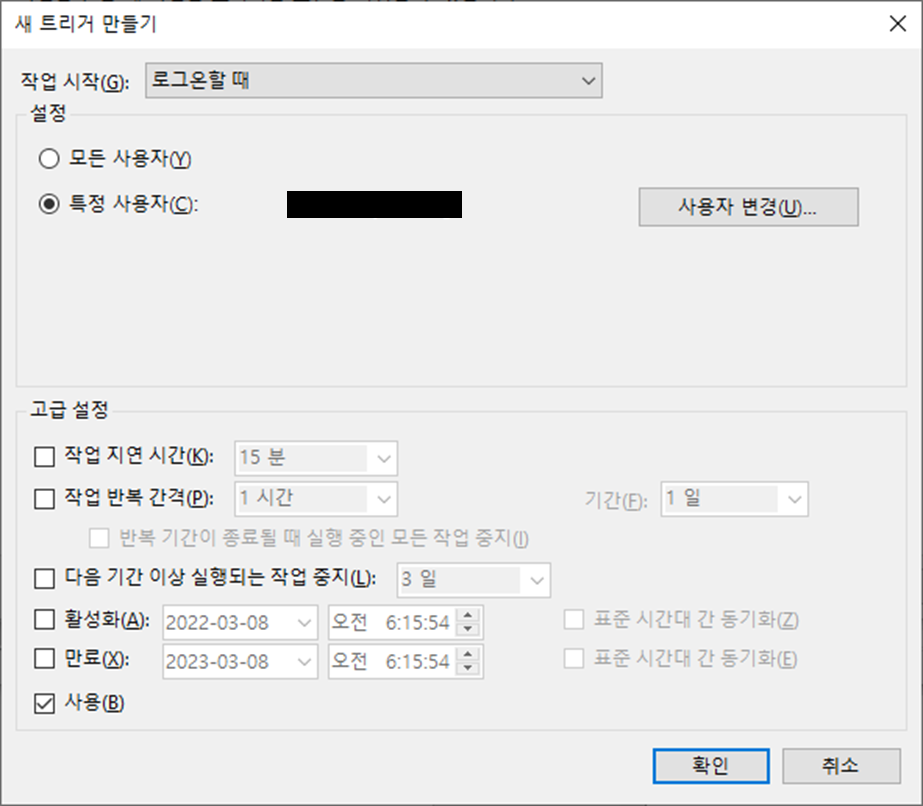 트리거 탭에서 ‘새로 만들기’를 누른 후, 배치 파일을 실행하는 조건값을 입력합니다. 저는 간단히 ‘로그온할 때’로 골랐습니다. 말 그대로 배치 파일을 실행하는 발동 조건이므로 각자 편의에 맞는 옵션을 고르시면 됩니다.