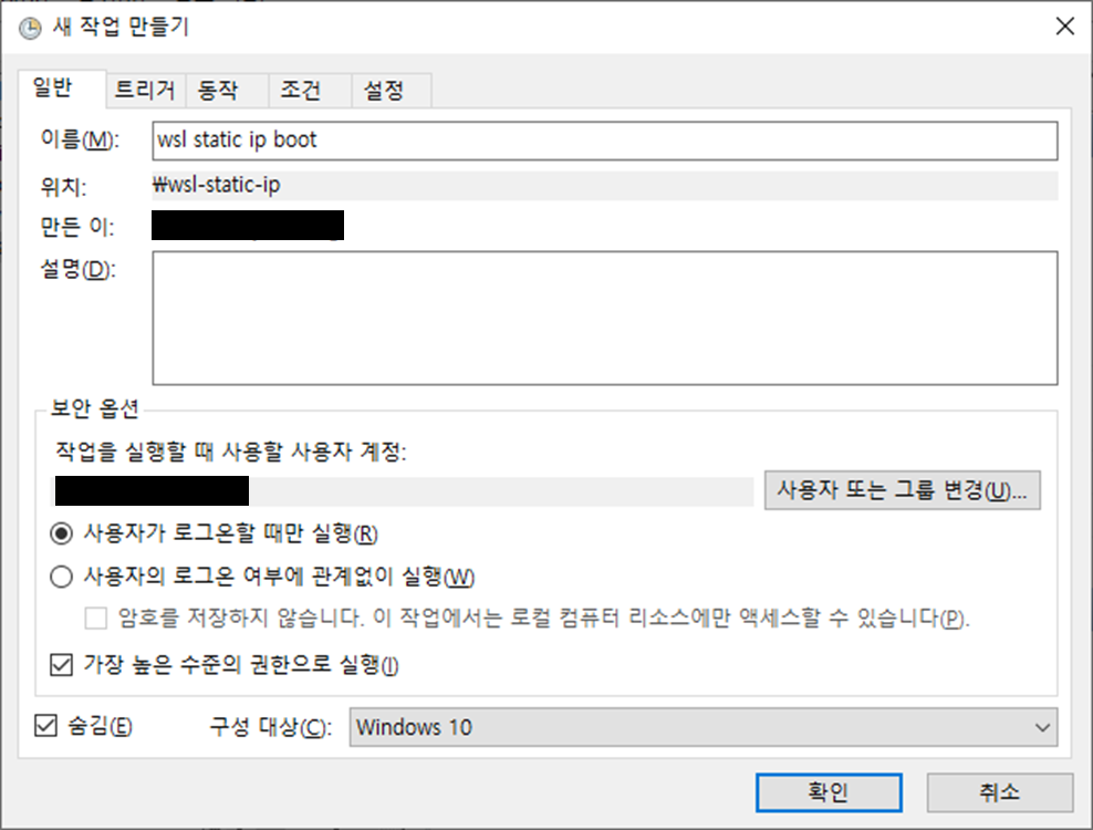 ‘wsl-static-ip’ 폴더를 클릭하고, 오른쪽 탭 메뉴에서 ‘작업 만들기’로 들어갑니다. 일반 탭에서 이름을 입력하고, ‘가장 높은 수준의 권한으로 실행’을 켜고 구성 대상에서 운영체제 버전을 선택합니다.