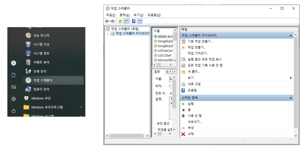 이제 윈도우에서 제공하는 작업 스케줄러에 위에서 만든 배치 파일을 추가하면 됩니다. 먼저 작업 스케줄러를 실행합니다.