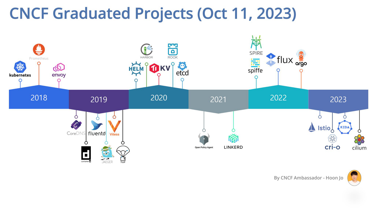 그리고 쿠버네티스와 밀접한 연관이 있는 클라우드 네이티브 컴퓨팅 재단(CNCF, Cloud Native Computing Foundation)에서도 성숙한 제품이라고 표현하는 졸업 프로젝트가 2023년 10월 11일 기준 총 24개가 발표되었습니다.