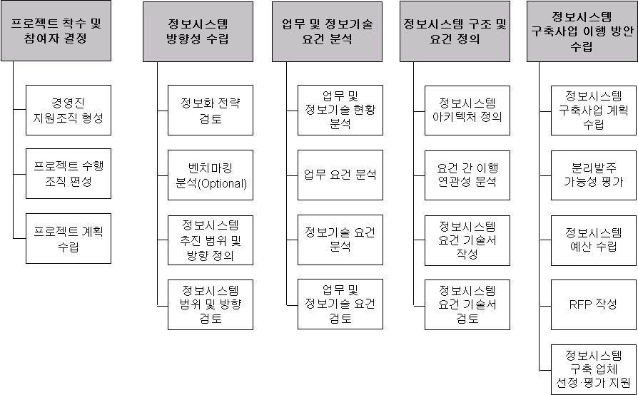 | 단계 5정보시스템 구축 사업 이행방안 수립 | 정보시스템 구축사업 계획 수립 | – 정보시스템 구축 범위 확정 |
