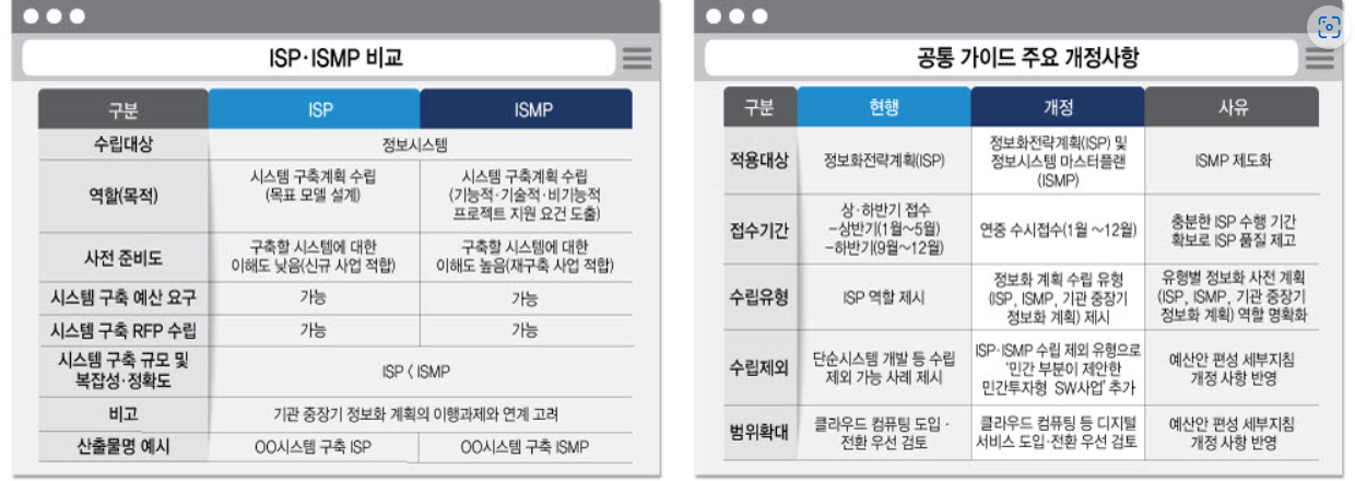 에 대한 요구사항을 상세히 기술함으로써 제안요청서(RFP) 작성 및 구축사업 계획을 수립한다는 점에서 차이를 보인다. ISMP는 대부분의 공공부문 SW사업에 적용해야 하나, 후속 구축사업의 비용 및 업무 측면에서 효율성을 평가하여 적용여부를 결정한다.