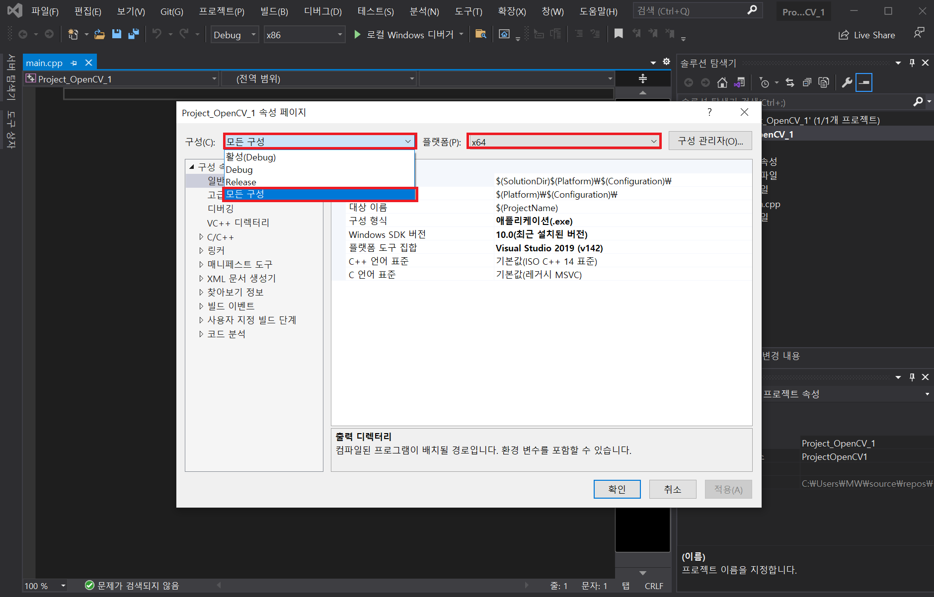 구성 : 모든 구성, 플랫폼 : x64로 하자 (기본 운영체제 구성이 64비트면 x64, 32비트면 win32를 선택하면 된다.)