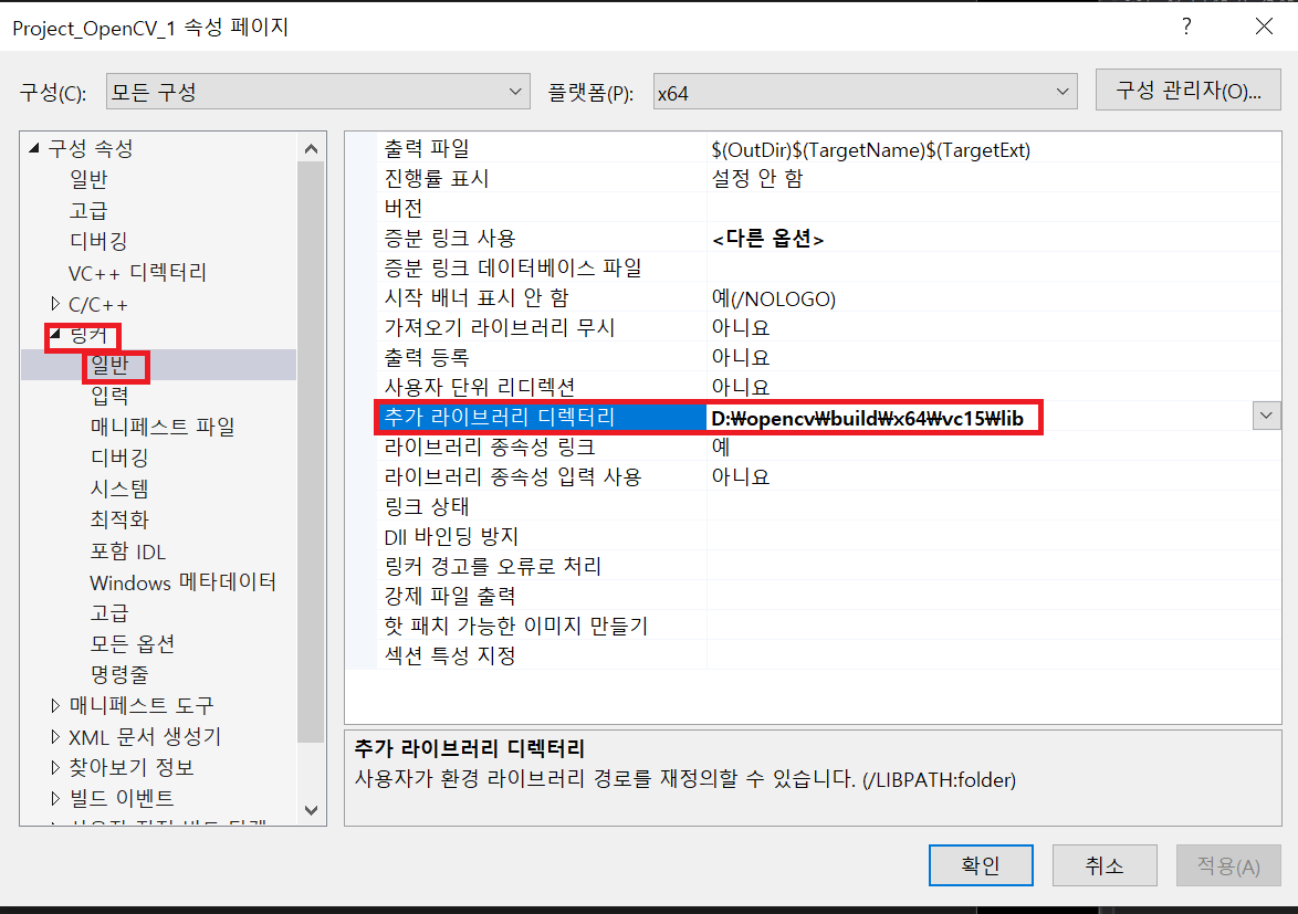 D:\opencv\build\x64\vc15\lib 를 입력해준다.
