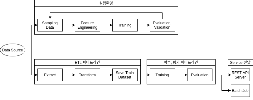 머신러닝은 기본적으로 실험이 개발입니다. 머신러닝 개발은 데이터 더미에서 유의미한 학습 데이터 만들기, 알고리즘 구현, 하이퍼 파라미터 최적화와 같은 일입니다. 이 과정에서는 원활한 실험을 위해 샘플링된 데이터를 사용하기도 하며, 최적화를 위한 다양한 시도들이 코드로 작성됩니다. 말 그대로 실험과 검증을 위한 코드가 개발됩니다. DevOps 와 달리 실험용 코드는 운영 가능한 형태가 아닙니다. 운영을 위해선 프로덕션 데이터의 ETL, 분산처리, 불필요한 로직 제거, 예측 추론 시간을 서비스 수준에 맞게 학습 단계 단순화와 같이 운영 수준의 변형과정이 필요합니다.