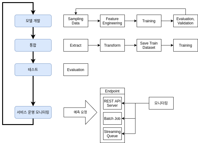 MLOps 의 통합은 실험환경에서 결정된 데이터 변형, 학습, 평가, 재학습 주기, 모니터링 지표 설정 등 실제 서비스 운영환경으로 통합되는 것을 의미합니다.