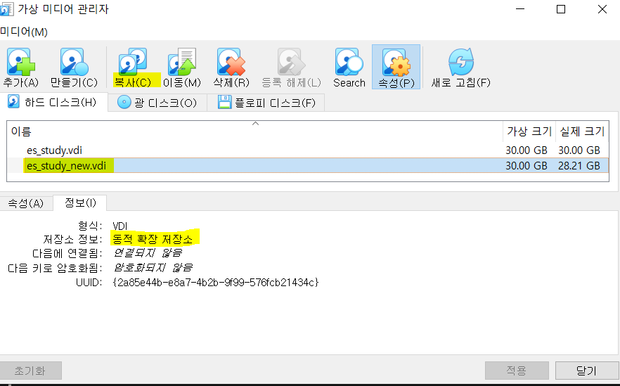 2. "파일" -> "가상 미디어 관리자" -> "복사(C)" 를 하게되면 동적 확장 저장소가 생성된다. (속성에서도 사이즈 변경이 가능하다.)