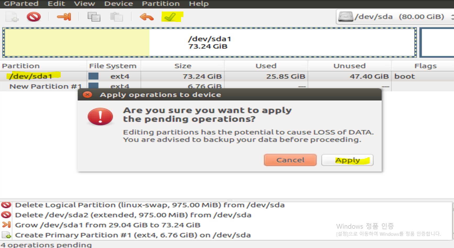 10. /dev/sda1(주 파티션)을 제외!! 하고 나머지 파티션들을 swap은 오른쪽 버튼을 눌러 swap-off 로 해주고 파티션을 삭제 한다. /dev/sda1 에서 오른쪽 버튼을 눌러 resize 한다. (2GB 정도는 swap 할 파티션을 지정 -> 필자는 그냥 6GB정도로 세팅)