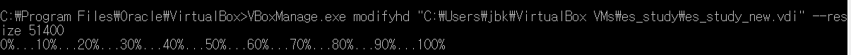 c:\{vm경로}>VBoxManage.exe modifyhd "{사용자경로(*.vdi가 생성되는경로)}" --resize 51400