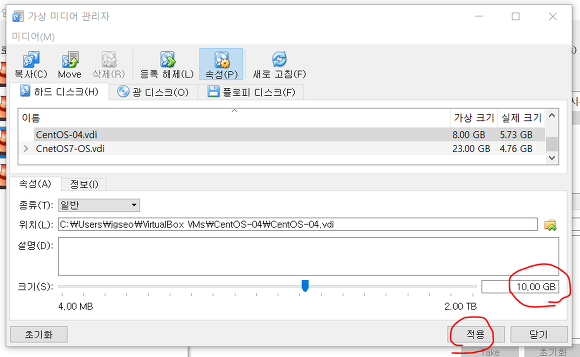증설하고자 하는 vdi를 선택 -> 원하는 크기로 늘린다. -> 적용 (줄이는 것은 안됨)