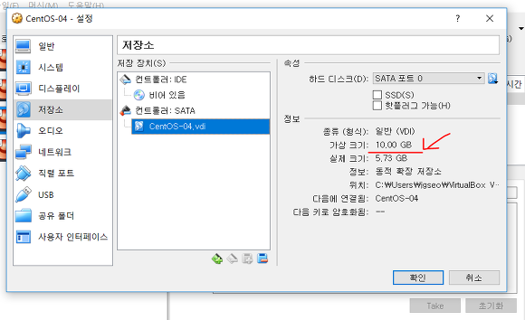 가상머신의 설정 -> 저장소 -> 용량 증가를 확인.