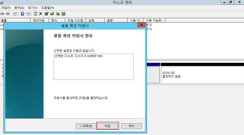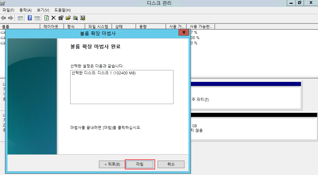 ⑤ [마침] 버튼을 클릭하여 볼륨 확장을 적용합니다.