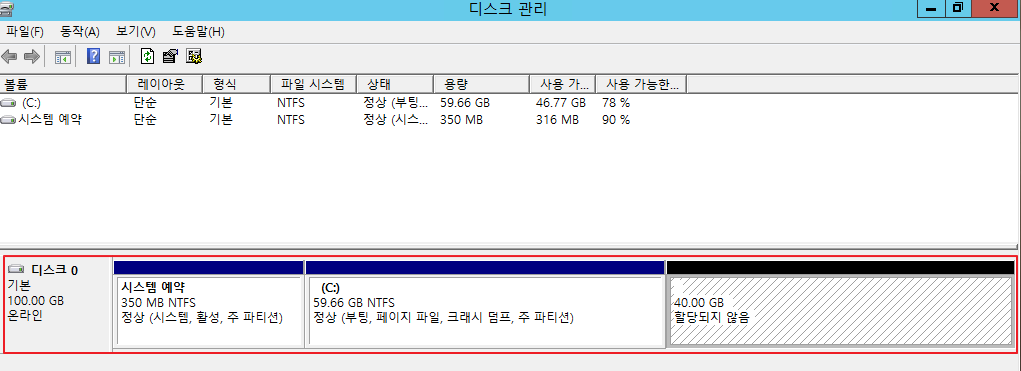 ① Disk 관리자에서 디스크0 크기는 50GB(실제는 60GB)에서 100GB로 확장되어 있으며 ‘C:’는 확장되기 전 상태로 할당되지 않은 40GB를 확인할 수 있습니다.