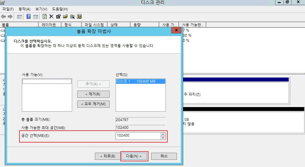 ④ 공간 선택에 할당되지 않은 100GB를 추가하거나 이미 입력된 용량 확인 후 [다음] 버튼을 클릭합니다.