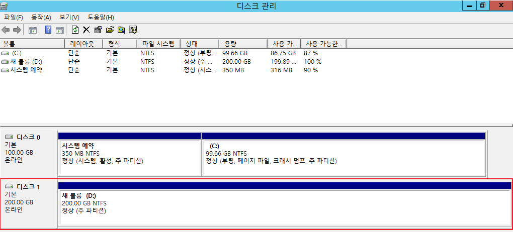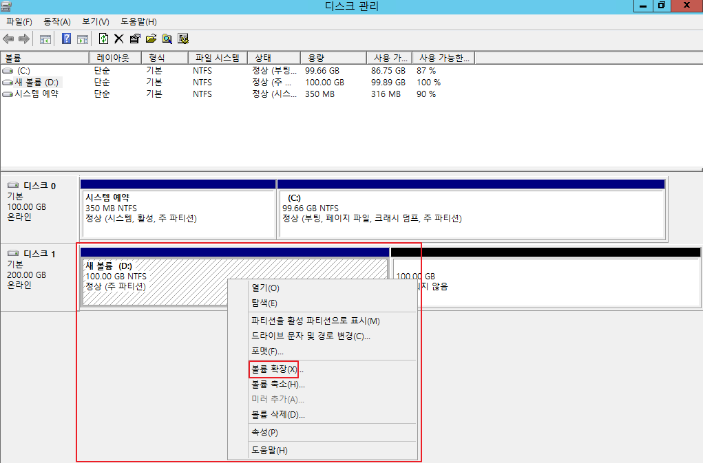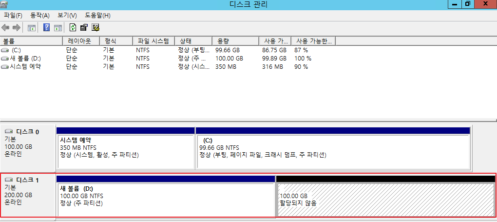 ① Disk 관리자에서 디스크1 크기는 100GB에서 200GB로 확장되어 있으며 ‘D:’는 확장되기 전 상태로 할당되지 않은 100GB를 확인할 수 있습니다.