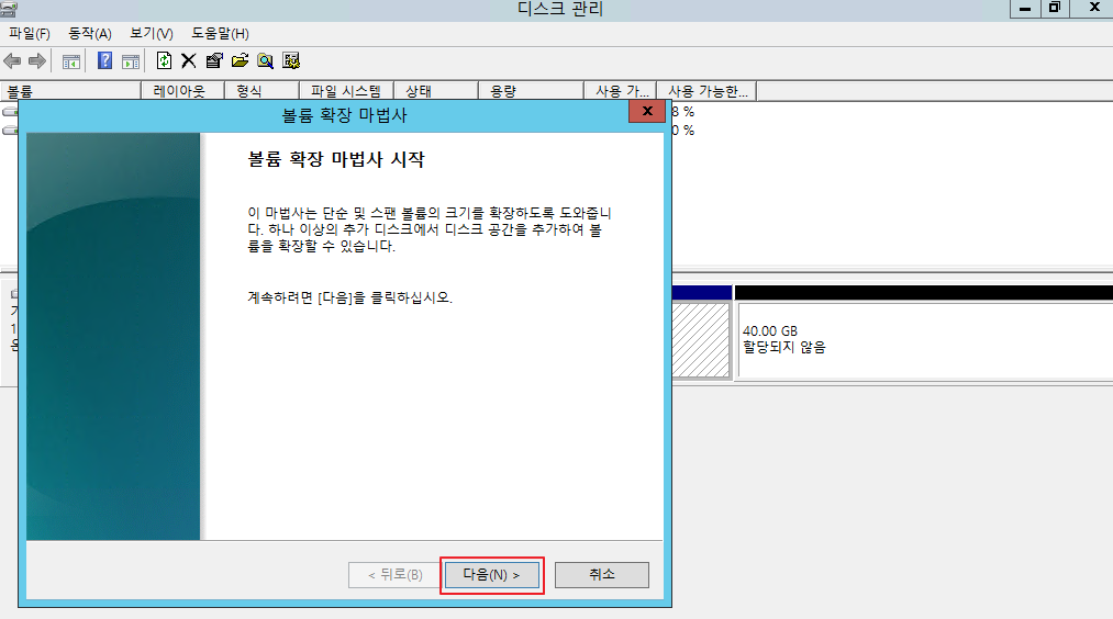 ③ 이후 열리는 ‘볼륨 확장 마법사’ 창에서 [다음] 버튼을 클릭합니다.