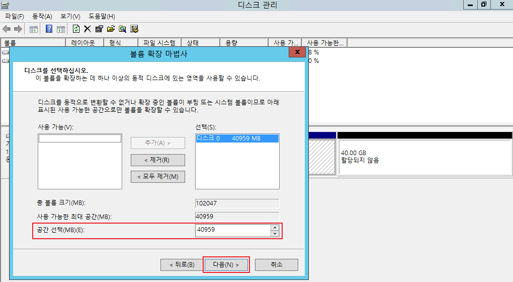 ④ 공간 선택에 할당되지 않은 40GB를 추가하거나 이미 입력된 용량 확인 후 [다음] 버튼을 클릭합니다.