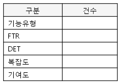 | 측정항목 | 데이터 기능 및 DET, RET수 도출 트랜잭션 기능 및 DET, FTR 식별 |