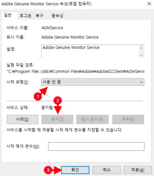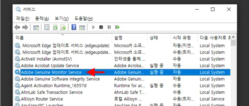시작 프로그램 뿐만 아니라 윈도우 서비스에도 Adobe Genuine Monitor Service 가 등록되어 있기 때문에 서비스 또한 사용하지 않게 중지해야 합니다.