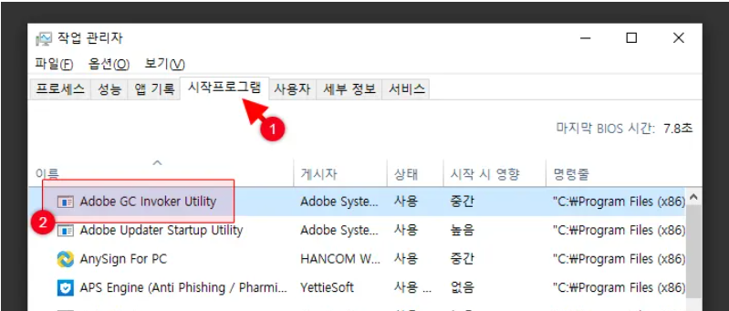 4. 시작프로그램 목록에서 Adobe GC Invoker Utility를 찾아 클릭한 다음 우측 하단의 ‘사용 안 함’을 클릭해 시작프로그램을 중지합니다.
