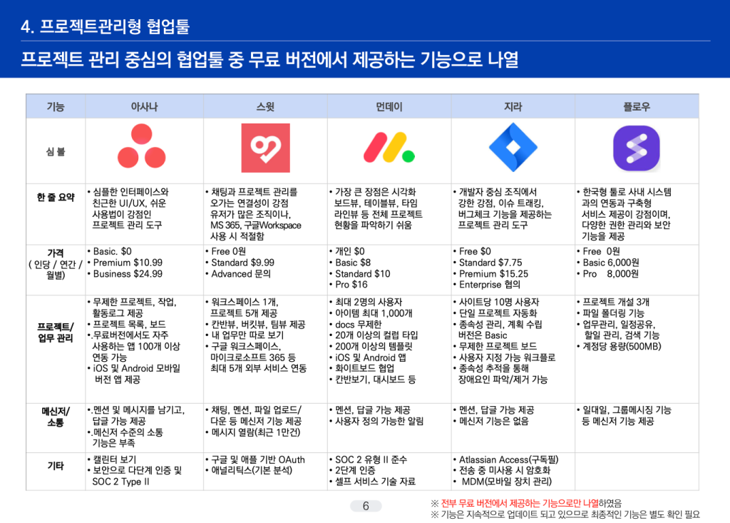 총 10가지 종류의 협업툴 중 무료 기능만을 가지고 비교하고, 하단에서는 좀 더 자세히 서술하겠습니다.