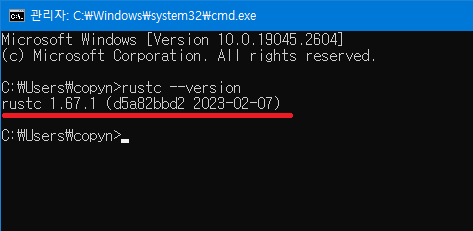 Rust가 잘 설치 되었는지 확인하기 위해 커멘드창을 띄워 버전정보를 확인해 보겠습니다.