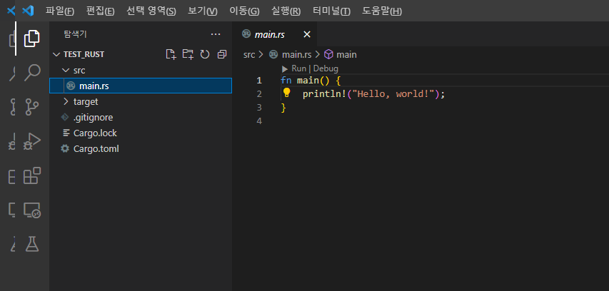 Visual Studio Code 를 실행하고 폴더열기 선택후 생성된 test_rust를 선택하고 열기를 누르면 다음과 같이 열립니다.