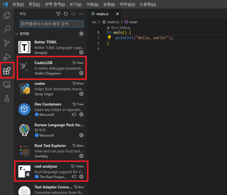 Rust를 구동하기 위해 몇개의 확장 프로그램을 설치해줘야 됩니다. vscode에서 rust를 사용할 수 있도록 코드를 분석해서 편하게 보여주는 rust-analyzer 와 디버깅을 하기 위해 사용되는 CodeLLDB 입니다.