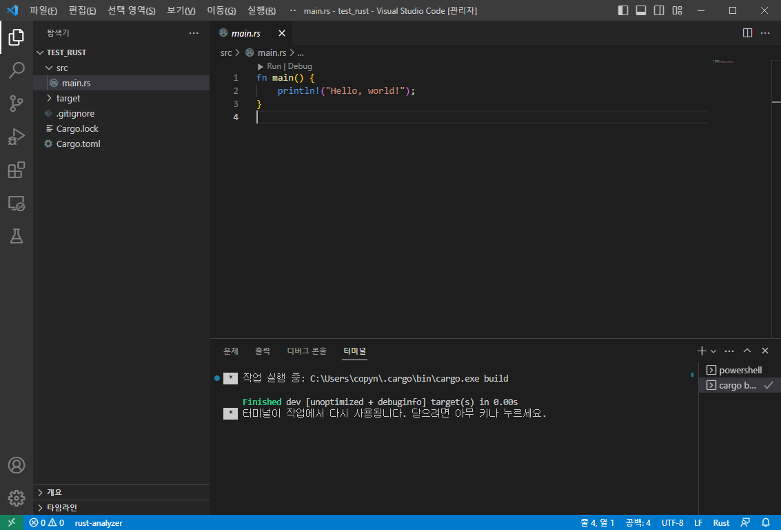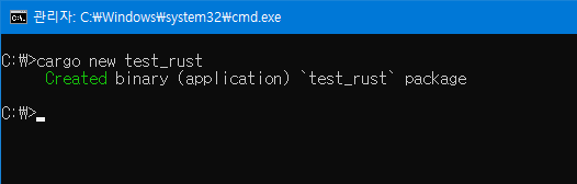 커멘드 라인에서 cargo new 프로젝트이름 입력하고 엔터를 누르면 hello world가 작성된 rust 기본 프로젝트가 생성됩니다.