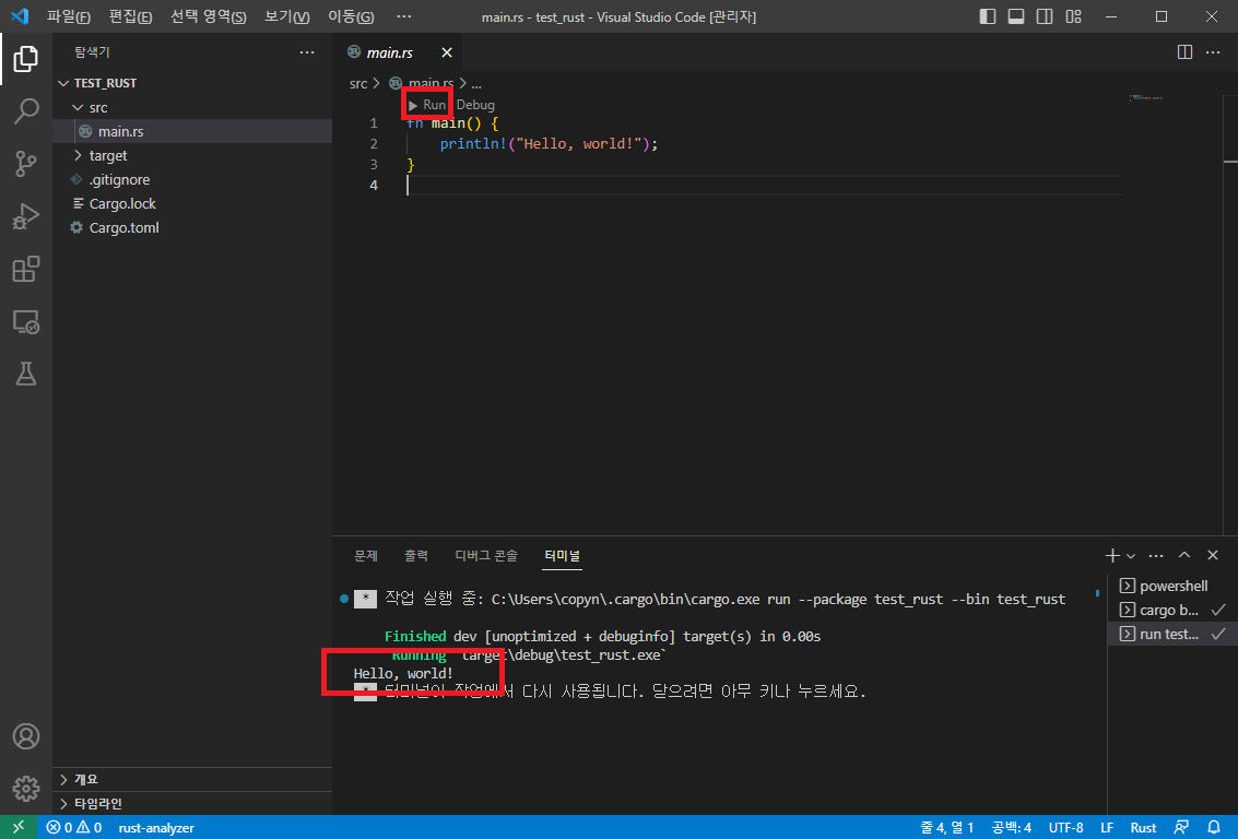 5. 생성된 Rust 프로젝트 Visual Studio Code에서 열기