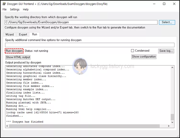 위와 같이 설정을 모두 마쳤다면, Run 탭에서 Run doxygen 버튼을 클릭하여 빌드합니다.