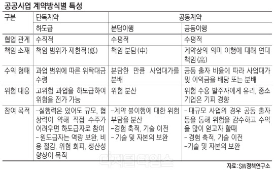 | 위험 대응 | 고위험 과업을 하도급하여 위험을 전가 가능 | 위험 분산 | 위험 수용 발주자에게 유리, 중소기업은 기피 경향 |