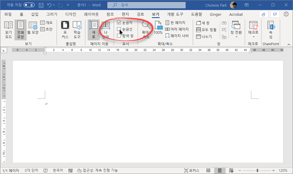 [보기] 메뉴에서 [눈금선]을 선택하면 일반 노트처럼 가로줄이 일정 간격으로 나타난다.