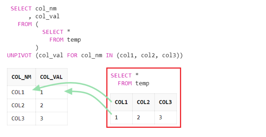 3개의 컬럼이 3개의 행으로 변환되었다. 컬럼 별칭(col_nm, col_val)은 내가 원하는 명칭으로 지정하면 된다.
