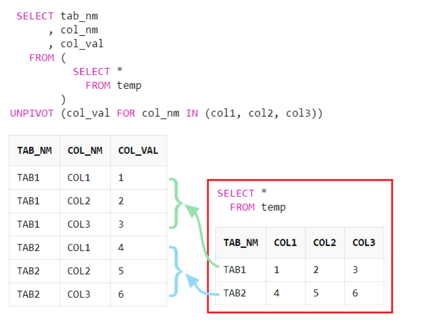 UNPIVOT 하지 않은 컬럼(tab_nm)의 값은 UNPIVOT 컬럼의 개수만큼 값이 복사되어 출력된다.