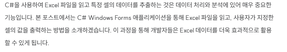 C#과 Microsoft.Office.Interop.Excel 라이브러리를 사용하여 Excel 파일에서 데이터를 읽고 처리하는 것은 비교적 간단합니다. 이 기술을 활용하면 엑셀 데이터를 다양한 방식으로 가공하고, 효율적인 데이터 관리 및 분석이 가능해집니다. 다음 포스트에서는 읽어온 데이터를 DataGridView에 표시하는 방법을 다룰 예정입니다.