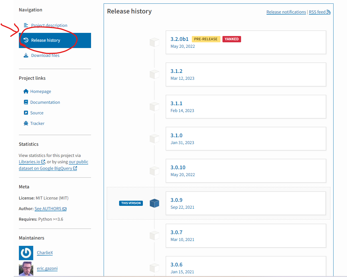 ++ 좌측 메뉴에서 Release history 메뉴를 클릭하면, 버전별로 패키지를 설치할 수 있다