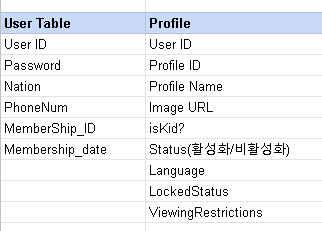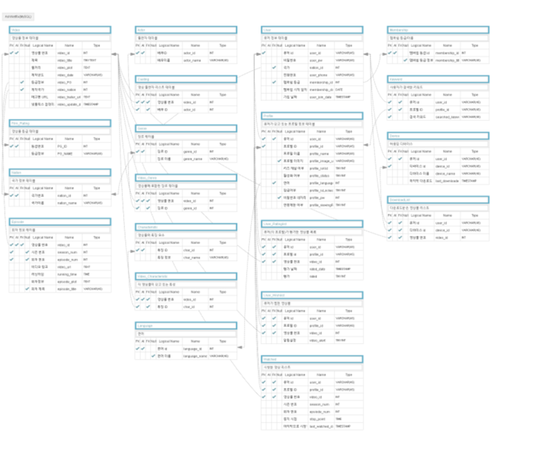 - Entity의 예시로는 영상물, 유저, 회차정보, 배우, 국가, 특징, 장르, 언어.. 이 있겠다.