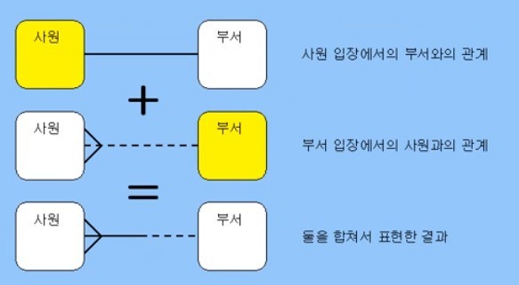 : 일대다/다대일 관계는 하나의 원소가 두개 이상의 원소와 관계를 맺는 것을 의미한다. 한 부서에는 여러명의 사원이 소속되어 있다.
